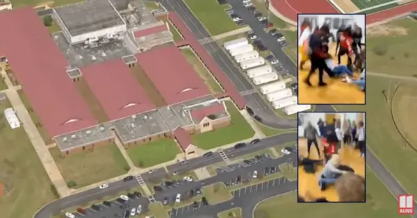 Ola Middle School i Henry County, Georgia (via YouTube screengrab/WXIA). Infogar: skärmdumpar från en inspelning av ett slagsmål på en mellanstadieskola i Georgia som lämnade en flicka med 14 knivhugg (tillhandahålls av advokat).
