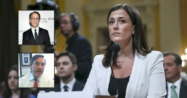 Cassidy Hutchinson, en före detta medhjälpare till Trump Vita husets stabschef Mark Meadows, vittnar under den sjätte utfrågningen av House Select Committee om upproret den 6 januari i Cannon House Office Building den 28 juni 2022 i Washington, DC. (Foto av Brandon Bell/Getty Images). Infälld topp: Andrew Weissman deltar i National Board of Review Awards Gala på Cipriani 42nd Street söndagen den 8 januari 2023 i New York. (Foto av Evan Agostini/Invision/AP). Infälld botten: Advokat Stefan Passantino dyker upp på LexBlog 2015 (via YouTube).
